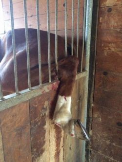 Il box per il cavallo è come la sua casa il suo territorio, a volte per farlo rispettare al vicino capita che calci… Questo è il risultato.