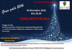 Il 29 Dicembre alle ore 20.30, i centri che sono stati insigniti da Sef Italia ed i cavalieri che si sono piazzati nei primi tre posti dei campionati regionali di: Cross Derby; Gimkana; Mountain Trail ed Alta Scuola, saranno premiati alla cena che si terrà presso “Ristorante Olympus” a Flumeri (AV) organizzata dal nostro centro SEF “Cavalieri del Principe”.